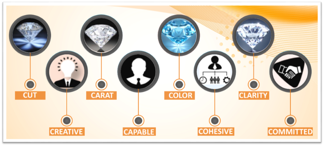 The 4Cs of Diamond Quality is the universal method for assessing the quality of any Diamond, anywhere in the world. Beautiful, Rare, Cherished; each diamond is unique and is a miracle of time, place and change. Each diamond has specific qualities that establish its value. By using the analogy of a diamond to describe the value of each professional , we at 4C CORPORATE SKILLS dedicate our efforts to polish the diamond like professional within you.